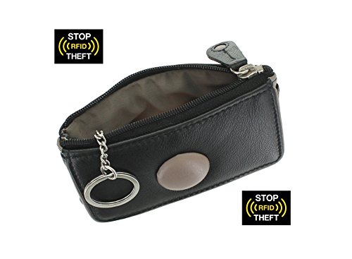 - Soft supple leather ladies coin purse with button and contrast piping detail 7.5cm x 11cm x 2.5cm. RFID or Radio-Frequency Identification involves the use of microchips which contain sensitive financial and personal data. This purse features RFID blocking technology which prevents unauthorised access to the data contained on contactless debit/credit cards whilst these cards are contained in the closed purse